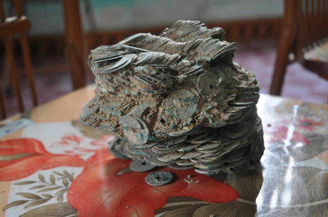 Nhưng rồi, làm nhà lại có bao nhiêu thứ phải chi, chần chừ mấy lần, cuối cùng tôi bán cả hai thúng tiền xu cổ ấy. Tổng cộng là 37 cân được hơn 600.000 đồng cho một người cùng làng tên là Ba Ngọc. Số tiền ấy tôi đủ chi trả cho công thợ hôm làm móng. Sau khi bán đi rồi, tôi mới hay vợ mình giữ lại được một túi, giờ ở nhà vẫn còn giữ lại rất nhiều”.