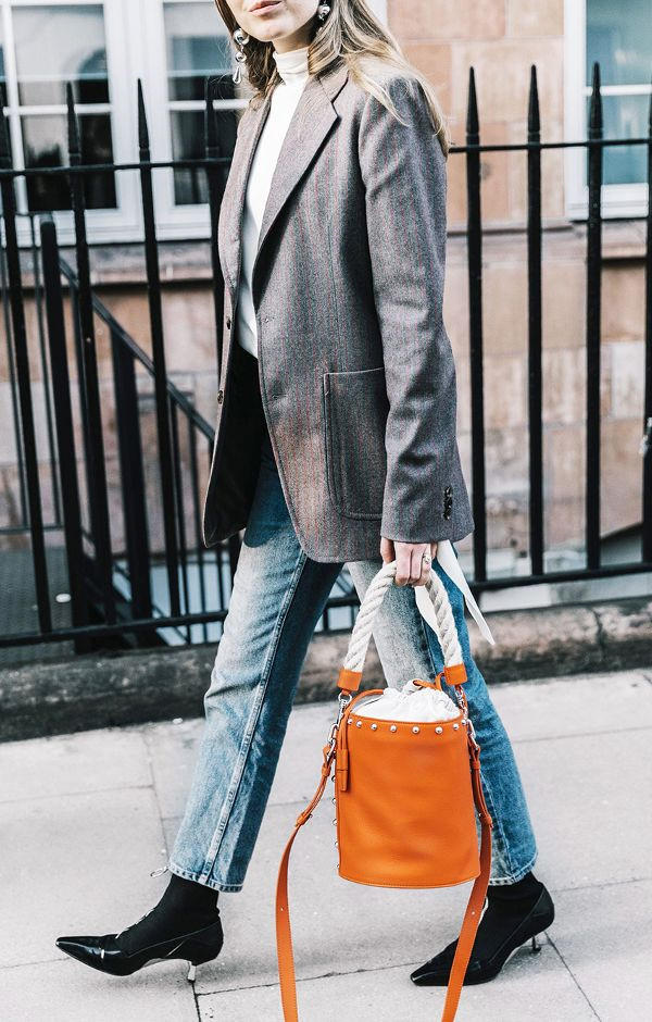 Lựa chọn một item chủ đạo trên bộ trang phục, phái nữ có thể mix chiếc túi xách màu sắc với set đồ mang hơi hướng menswear như blazer xám, áo len, quần jeans và trào lưu diện tất cùng giày cao gót.