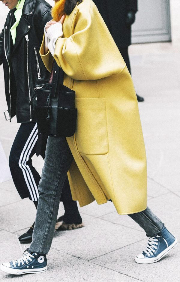 Một chiếc áo khoác dáng dài gam màu vàng mustard sẽ trở nên tinh tế và thời thượng hơn khi được mix cùng các items thời trang như quần jeans ống đứng và giày sneaker sắc xanh denim.
