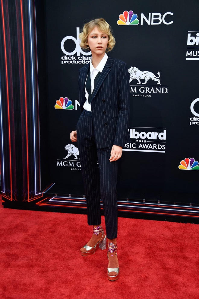 Sao nhí Grace VanderWaal ghi điểm nhờ bộ suit thanh lịch, cá tính, kết hợp đôi sandal màu bạc ánh kim độc đáo. Cô bé 14 tuổi từng gây sốt khi đăng quang America's Got Talent năm 2016, được giám khảo Simon Cowell gọi là "tiểu Taylor Swift". Không chỉ sở hữu chất giọng đặc biệt, VanderWaal còn có thể chơi đàn ukulele, tự sáng tác.