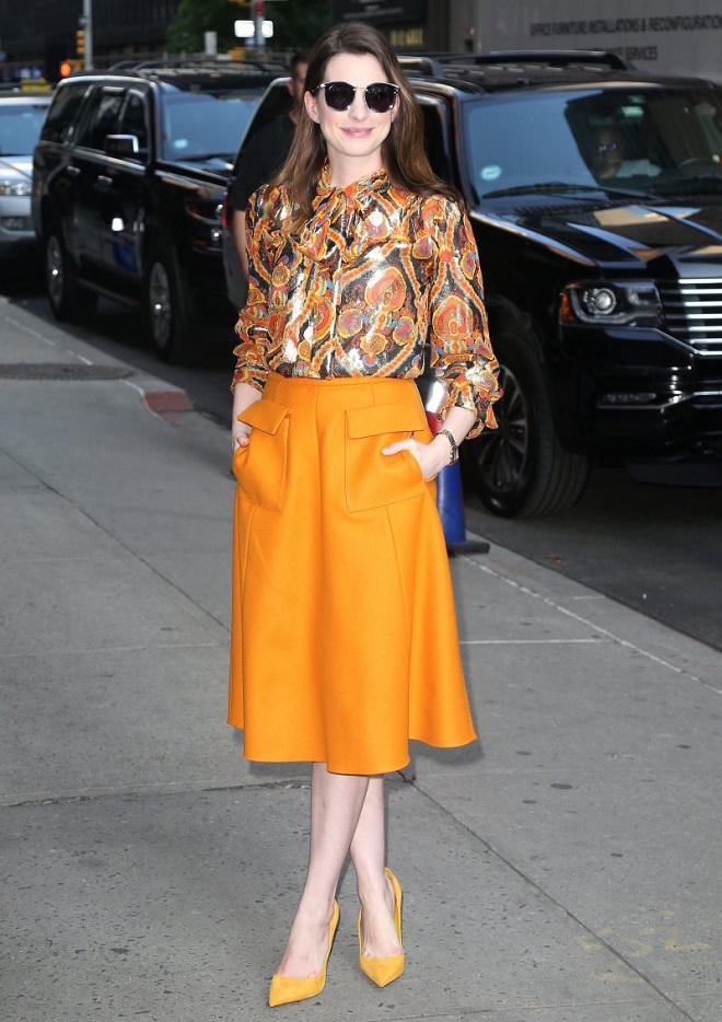 Danh sách sao đẹp tuần còn có minh tinh Anne Hathaway, xuất hiện trong bộ cánh phong cách monochrome thập niên 70. Những ngày qua, cô cùng dàn sao đình đám gồm Sandra Bullock, Cate Blanchett, Helena Bonham Carter bận rộn với lịch trình quảng bá bộ phim hài hành động vui nhộn mang tên Ocean’s 8 chuẩn bị ra mắt.