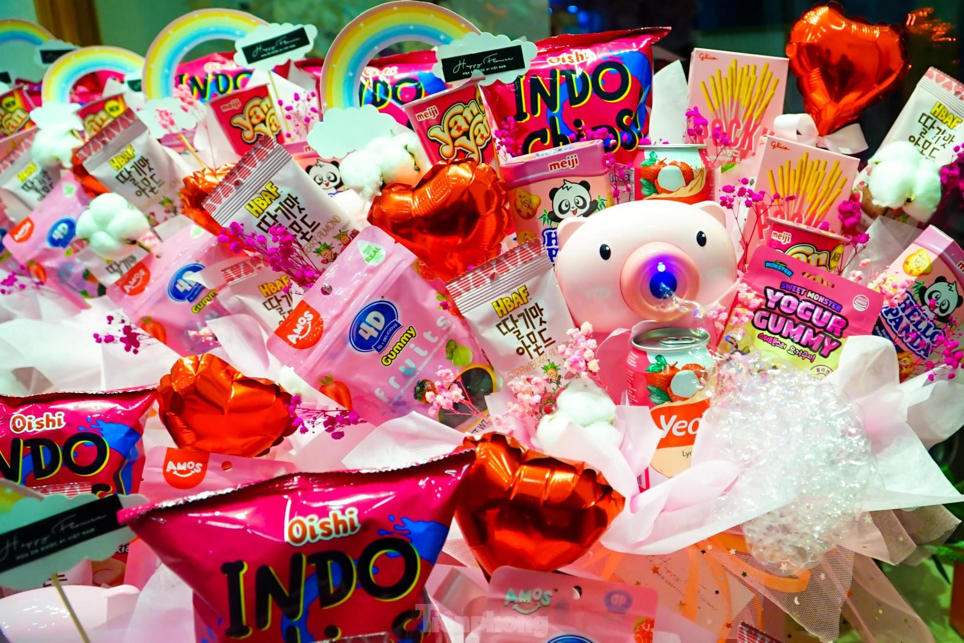 Đây là bó hoa vĩnh cữu kèm theo socola được đặt theo yêu cầu của khách khiến nhiều bạn trẻ rất thích thú. Ảnh: VIÊN VY