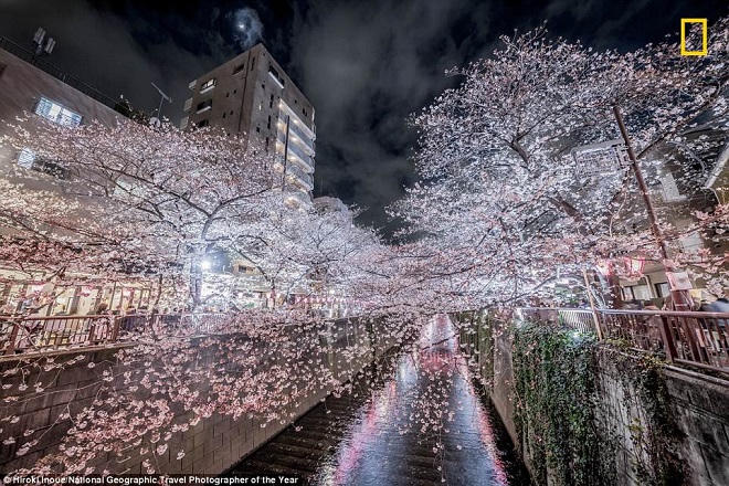 Bức ảnh rừng hoa anh đào rực rỡ vào ban đêm ở quận Nakameguro ở thủ đô Tokyo, của nhiếp ảnh gia Hiroki Inoue.