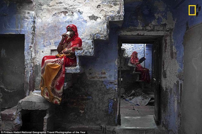 2 cô gái ngồi trên cầu thang nhà họ đang đọc sách và nhâm nhi cốc masala chai ở Rajasthan, Ấn Độ. Bức ảnh được chụp bởi nhiếp ảnh gia Firdaus Hadzri người Malaysia.