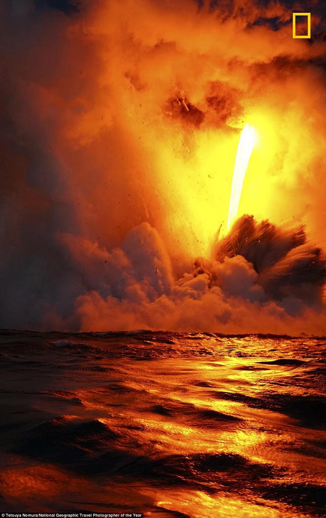 Dung nham chảy vào biển sau đợt phun trào núi lửa ở Bolivia. Nhiếp ảnh gia người Nhật Bản Tetsuya Nomura cho biết, "một vụ nổ lớn xuất hiện và không khí nóng tỏa ra, khiến ống kính máy ảnh của tôi bao phủ một lớp sương và bụi...".