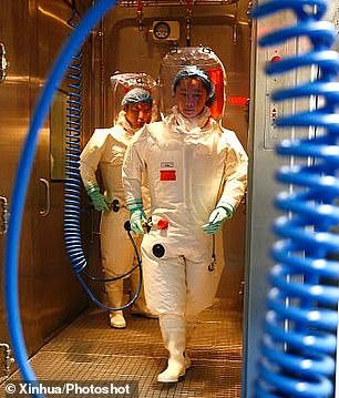 Các nhà nghiên cứu mặc đồ bảo vệ toàn thân và đội tấm chắn đầu trong khi tiến hành thí nghiệm.