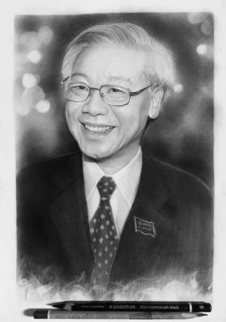 Bức tranh bằng chì than của Nguyễn Thị Phượng tưởng nhớ về Tổng Bí thư Nguyễn Phú Trọng. (Ảnh: Thanhnien.vn) |