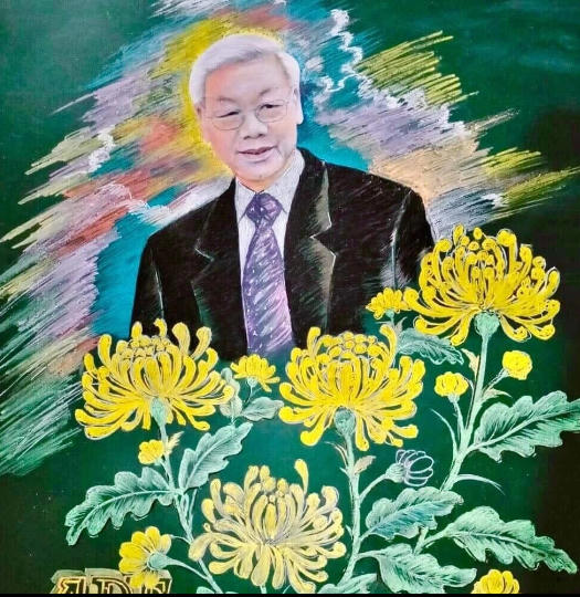 Có tình cảm đặc biệt, sự kính trọng đặc biệt với Tổng Bí thư Nguyễn Phú Trọng - người học trò xuất sắc của Chủ tịch Hồ Chí Minh, nên khi nghe tin Tổng Bí thư Nguyễn Phú Trọng qua đời, thầy giáo Phan Văn Phúc (66 tuổi, trú huyện Thạch Hà, Hà Tĩnh), giáo viên bộ môn mỹ thuật của Trường THCS Phan Huy Chú, huyện Thạch Hà đã vô cùng đau lòng, hụt hẫng. Để bày tỏ niềm thương tiếc đó, chiều chủ nhật (21/7), trước giờ lên lớp tại nhà, thầy Phúc đã dùng phấn nhiều màu sắc vẽ tác phẩm chân dung Tổng Bí thư Nguyễn Phú Trọng lên bảng chống lóa. Bức vẽ được thầy Phúc thực hiện trong vòng 2 tiếng đồng hồ.