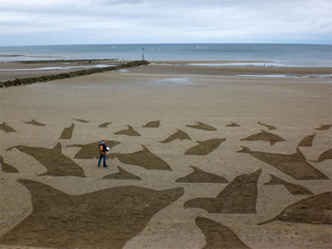 Chấp nhận mất bức tranh mà mình đã dày công sáng tạo mỗi khi thủy triều dâng là một phần tất yếu trong cuộc sống của một nghệ sĩ vẽ tranh cát. "Tôi chẳng bận tâm khi những bức tranh biến mất", Wardley tâm sự. Trong hình là đàn cá heo "bơi lội" trên bãi biển Colwyn Bay, Conwy, xứ Wales.