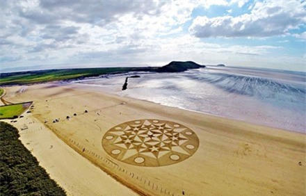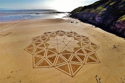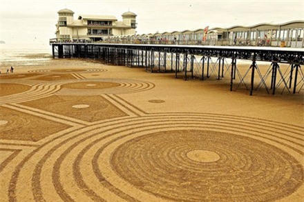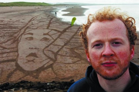 Trên khắp các bãi biển miền bắc của nước Anh và Scotland, người nghệ sĩ 37 tuổi miệt mài vẽ nên những bức tranh cát khổng lồ.