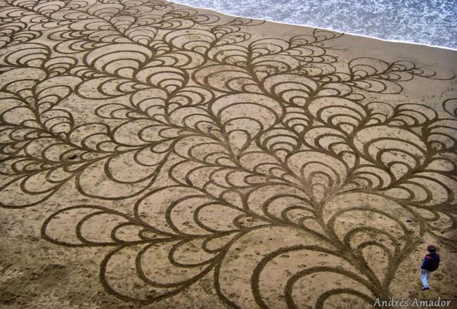 Andres Amador đến từ San Francisco, Mỹ. Anh sử dụng bãi biển như giấy vẽ và một chiếc cào dùng làm bút.