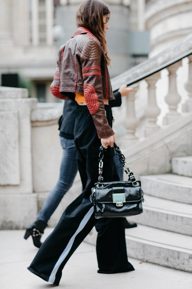 Nếu trong tủ đồ của bạn có sẵn jacket da, hãy mặc nó với quần thể thao để có vẻ ngoài cá tính.