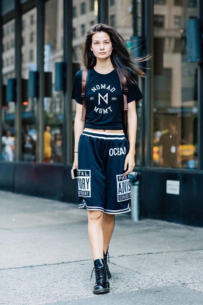 Với quần lửng thể thao in logo hay slogan, bạn nên tìm một chiếc áo phông đồng điệu về màu sắc lẫn họa tiết, tạo thành thể thống nhất. Một đôi bốt biker khỏe khoắn, hầm hố với ba lô là sự lựa chọn hợp lý.