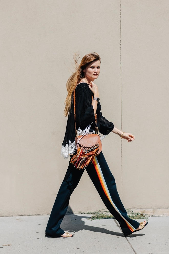 Quần thể thao ống suông rộng và dài khi mặc kèm áo ba lỗ sẽ tạo nên vẻ thoải mái. Để tăng vẻ thời trang, hãy dùng giày cao gót và túi xách cói.