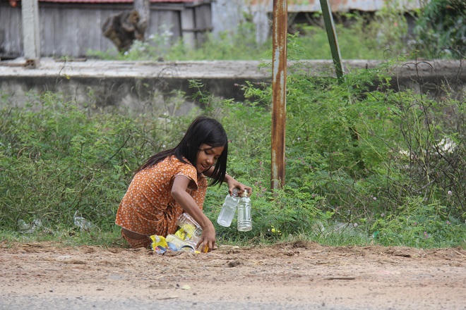 “Nhà mình hết gạo miết miết mà. Nhà trồng có 1 sào lúa thôi. Chồng mình thường ngày đi làm thuê cho người ta. Hôm nay không có việc nên nó đi nhậu rồi. Mình thường ngày cũng đi nhặt phân bò, 2 ngày nhặt một bao bán lại cho người ta được 40 ngàn. Nhưng hôm nay đứa nhỏ bị ốm nên phải ở nhà với nó.” Chị Loh chỉ vào đứa con út giọng buồn rầu.