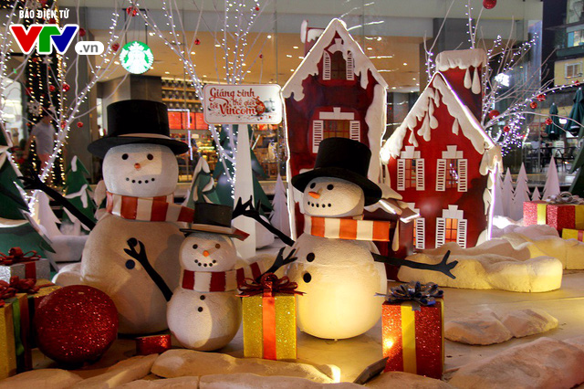 Mô hình nhà gỗ, người tuyết cũng được dựng bên cạnh cây thông, tạo thành địa điểm check-in không thể bỏ qua đối với nhiều người dịp Giáng sinh này