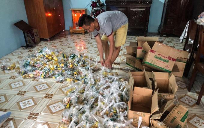 Anh Nguyễn Văn Nơi, 39 tuổi, con trai ông Tới đang chia những phần quà là gia vị để tặng tiếp cho mọi người trong hẻm. Ảnh: Nhân vật cung cấp.