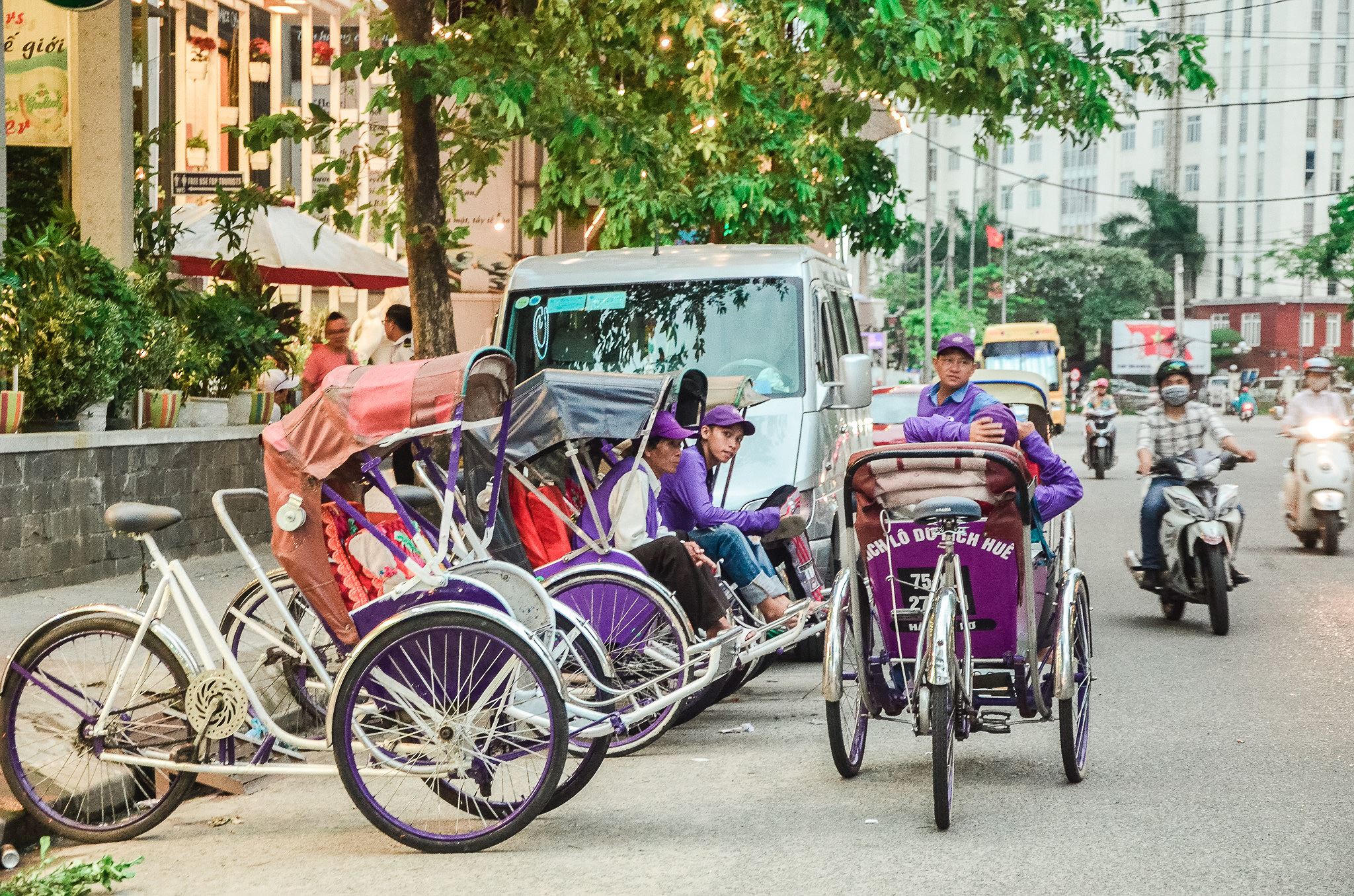 Nói đến màu sắc đặc trưng của một thành phố, hẳn chỉ có màu tím như đã dành riêng cho Huế. Cũng chính vì điều đó, màu tím luôn được sử dụng như một điểm nhấn trong cách tân trang những chiếc xích lô hay lựa chọn đồng phục cho dịch vụ này. Chiếc xe màu tím di chuyển chầm chậm giữa một biển người, ô tô, xe máy cũng là một nét duyên mộc mạc gợi thương gợi nhớ.
