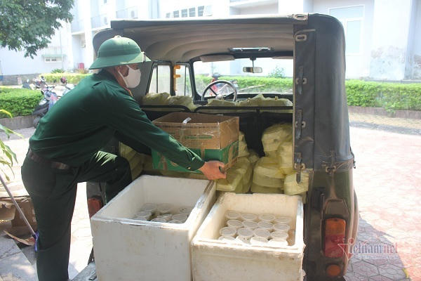 | Những suất cơm đầy tình nghĩa sau khi nấu xong được đưa lên xe chở đến khu cách ly phát cho các công dân từ nước ngoài về |