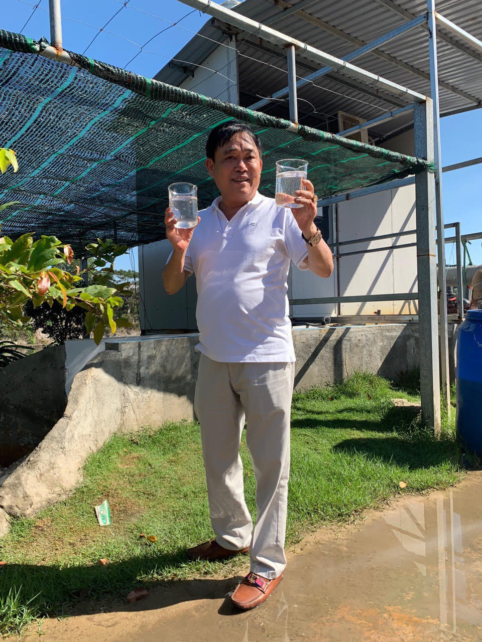 | Ông Huỳnh Uy Dũng vui mừng khoe sản phẩm nước thải được xử lý đạt đến tiêu chuẩn 02 của Bộ Y tế - có thể dùng để sản xuất, sinh hoạt |