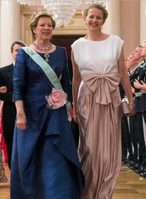 Hoàng hậu Anne-Marie của Hy Lạp (trái) mặc đầm xanh coban với hoa hồng trang trọng cài ngang hông, trong khi công nương Mabel Orange-Nassau của Hà Lan chọn trang phục yêu thích là chiếc đầm suit nhẹ nhàng, nhấn ngay vùng eo với chiếc nơ to bản.