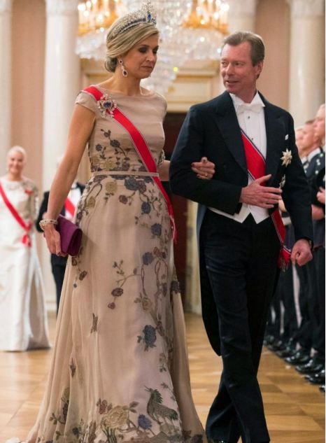 Công nương Maxima cùng Henri, đại công tước Luxembourg đến Na Uy vào ngày 9/5, tại đây bà xuất hiện với trang phục đầm dài làm từ chất liệu voan, có họa tiết được thêu thủ công cực kỳ tinh xảo.