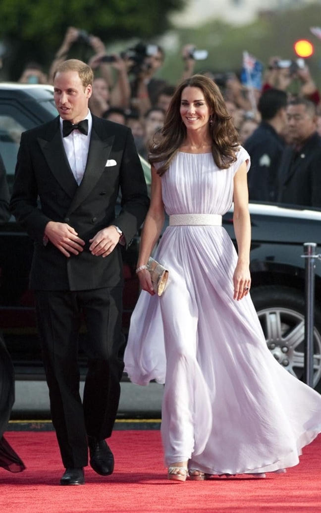 Công nương xứ Cambridge chọn trang phục được đánh giá là quyến rũ nhất thế giới với màu trắng pha tím, đầm dài 2 tầng kết hợp những nếp xếp ly đầy tinh tế, phần nịt eo giúp cô càng thêm xinh đẹp.