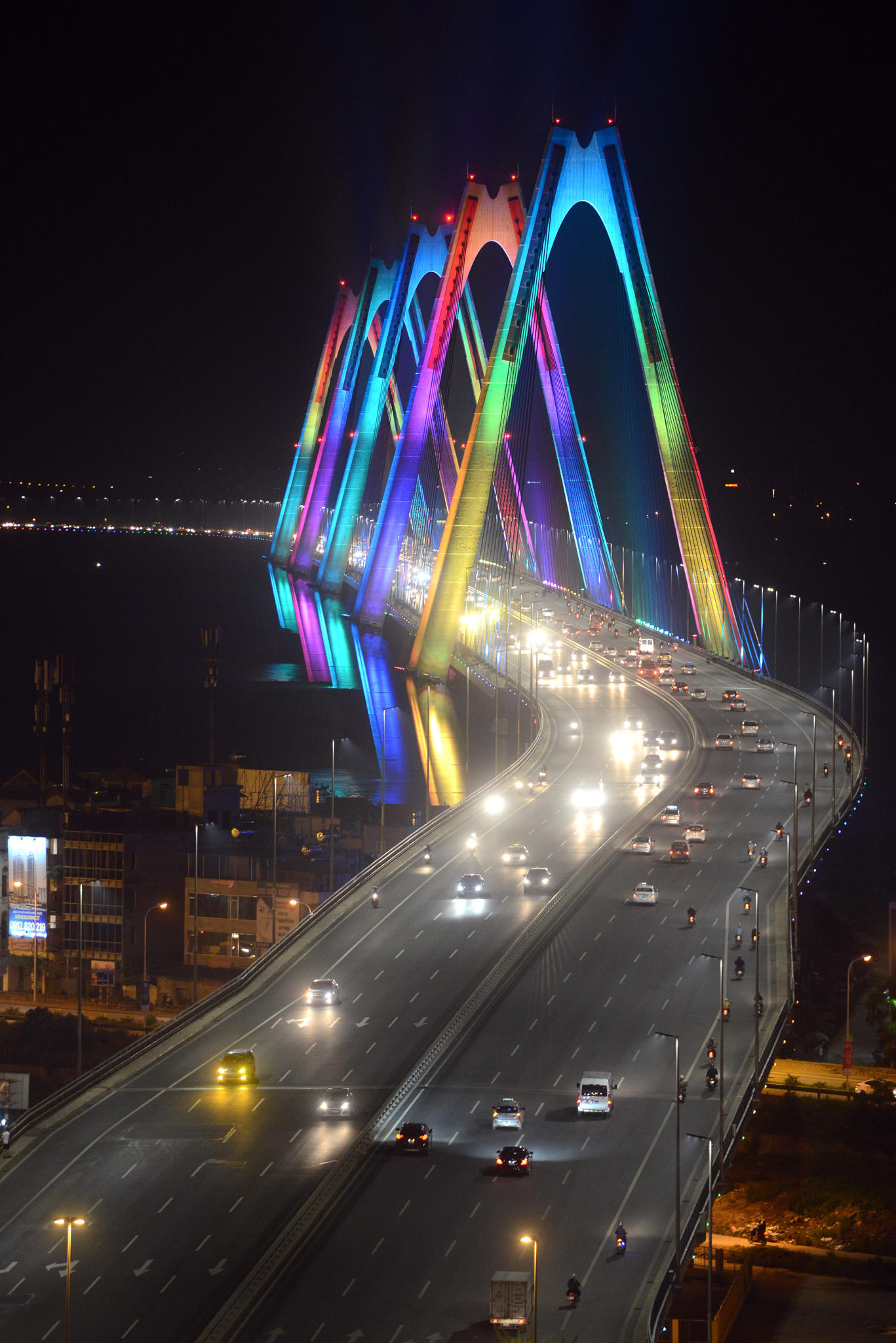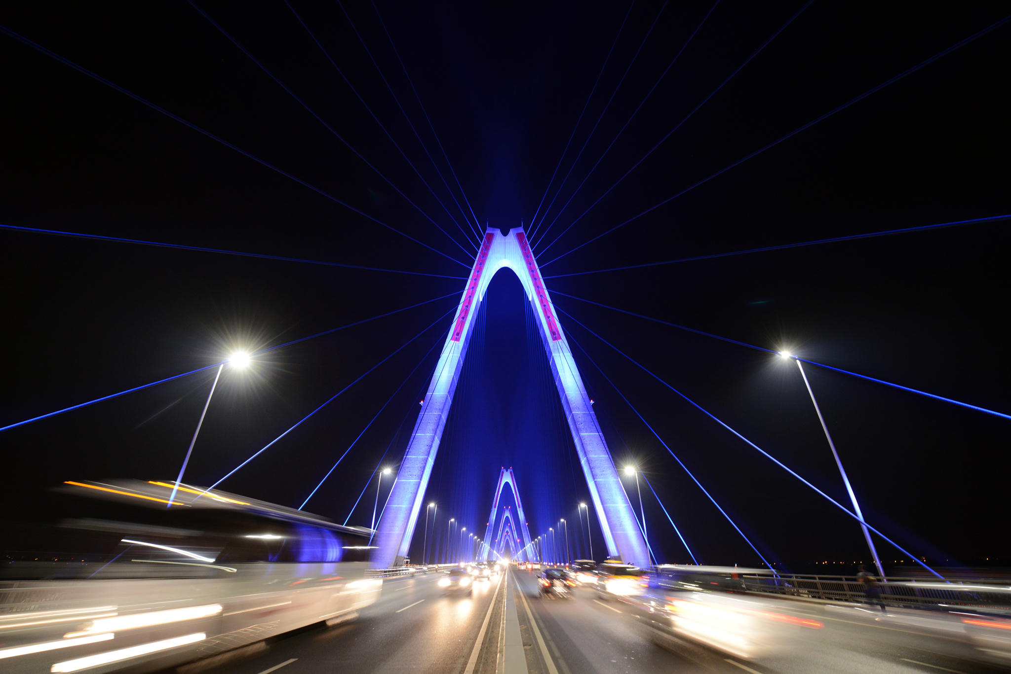 Không chỉ cung cấp đầy đủ ánh sáng cho toàn bộ không gian giao thông trên cầu Nhật Tân, hệ thống chiếu sáng mỹ thuật thông minh, ứng dụng công nghệ chiếu sáng hiện đại nhất hiện nay còn cho phép lập trình hiệu ứng đổi màu linh hoạt theo các ngày hoặc cảm ứng theo mùa.
