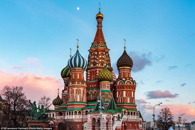 Nhà thờ St Basil đẹp rực rỡ bên trong Quảng trường Đỏ ở thủ đô Moscow, Nga. Nhà thờ có sự giao thoa về màu sắc, hoa văn và kiến trúc, được đánh giá là đỉnh cao trong phong cách nghệ thuật kiến trúc đặc trưng của Nga.