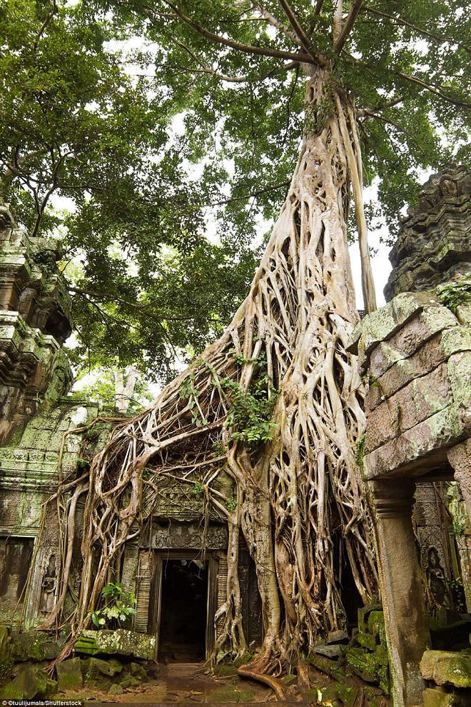 Một trong những lối vào ngôi đền Angkor Wat nổi tiếng nằm ở Siem Reap, Campuchia, có chiều dài hơn 800 m và được bao quanh bởi một hào nước.