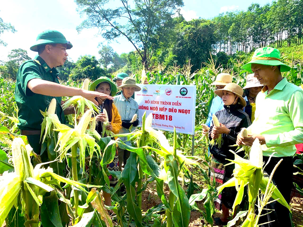 Thiếu tá Nguyễn Văn Bằng, Chính trị viên phó, Đồn Biên phòng Hướng Phùng hướng dẫn bà con chăm sóc cây ngô. |