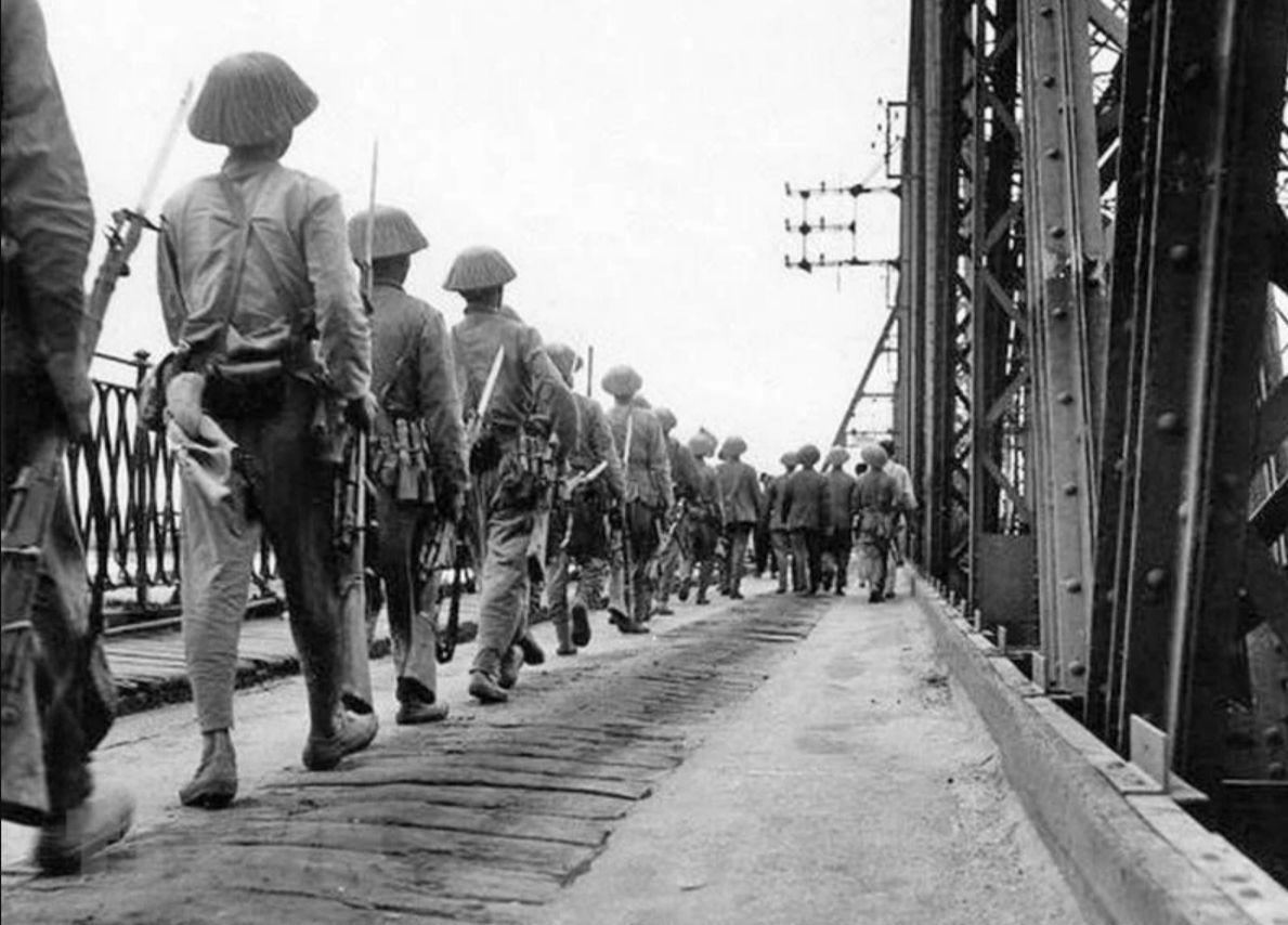 Bộ đội ta hùng dũng tiến qua cầu Long Biên vào tiếp quản Hà Nội, cùng lúc quân Pháp rút khỏi Hà Nội qua cây cầu này phía chiều bên kia, chiều 9/10/1954. (Ảnh: Tư liệu TTXVN) |