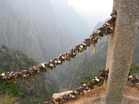 Dãy Hoàng Sơn của Trung Quốc thuộc phía Nam của tỉnh An Huy là điểm du lịch hấp dẫn với cảnh quan tuyệt đẹp. Một trong những đỉnh núi cao của dãy Hoàng Sơn là những đoạn dây cáp được căng hai bên bờ vực sâu. Nơi đây có những chiếc ổ khóa khắc tên các đôi uyên ương từng tới đây du ngoạn và ghi lại kỷ niệm đẹp. Dịch vụ bán ổ khóa và khắc tên ở khu vực này đang ngày một tấp nập.