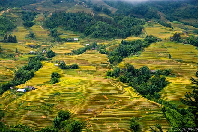 Mùa lúa chín Tây Bắc diễn ra vào từ tháng 9-10 hàng năm. Vào thời gian này, các cánh đồng được nhuộm màu vàng rực của lúa tạo nên bức tranh thiên nhiên hùng vĩ và thơ mộng, thu hút nhiều du khách đến thưởng ngoạn. Ảnh: Meogia.