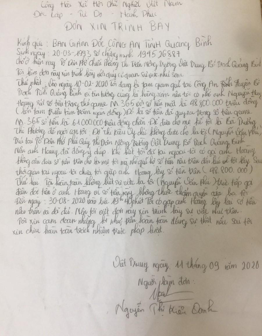 Biết tin ông Hoàng bị bắt, ngày 11/09/2020 bà Oanh gửi Đơn trình bày cho Công an tỉnh Quảng Bình với nội dung: “Thứ nhất: Vào ngày 10/02/2020, tôi đang bị tạm giam giữ tại Công an huyện Bố Trạch, tỉnh Quảng Bình vì tin tưởng là hàng xóm nên tôi có nhờ anh Nguyễn Huy Hoàng rút số tiền trong thẻ game M365 với số tiền mặt 48.800.000 đồng (bốn mươi tám triệu tám trăm ngàn đồng). Đó là số tiền đã quy ra trong số tiền game M365 số tiền là 61.000.000 đồng, để đưa cho mẹ kế tôi là bà Trương Thị Phượng để nuôi con tôi: Đỗ Thị Kiều Vy, chứ không đưa cho ba tôi (Nguyễn Văn Phú), trú tại tổ dân phố Phú Quý, thị Trấn Nông Trường Việt Trung, Bố Trạch, Quảng Bình, nên anh Hoàng đã đồng ý giúp. Khi biết tôi đã tại ngoại tôi có gọi anh Hoàng không cần đưa số tiền trên cho mẹ tôi mà giữ hộ số tiền nêu trên đến lúc về tôi lấy. Sau thời gian tại ngoại tôi chưa tới gặp anh Hoàng lấy số tiền trên (48.800.000 đ).