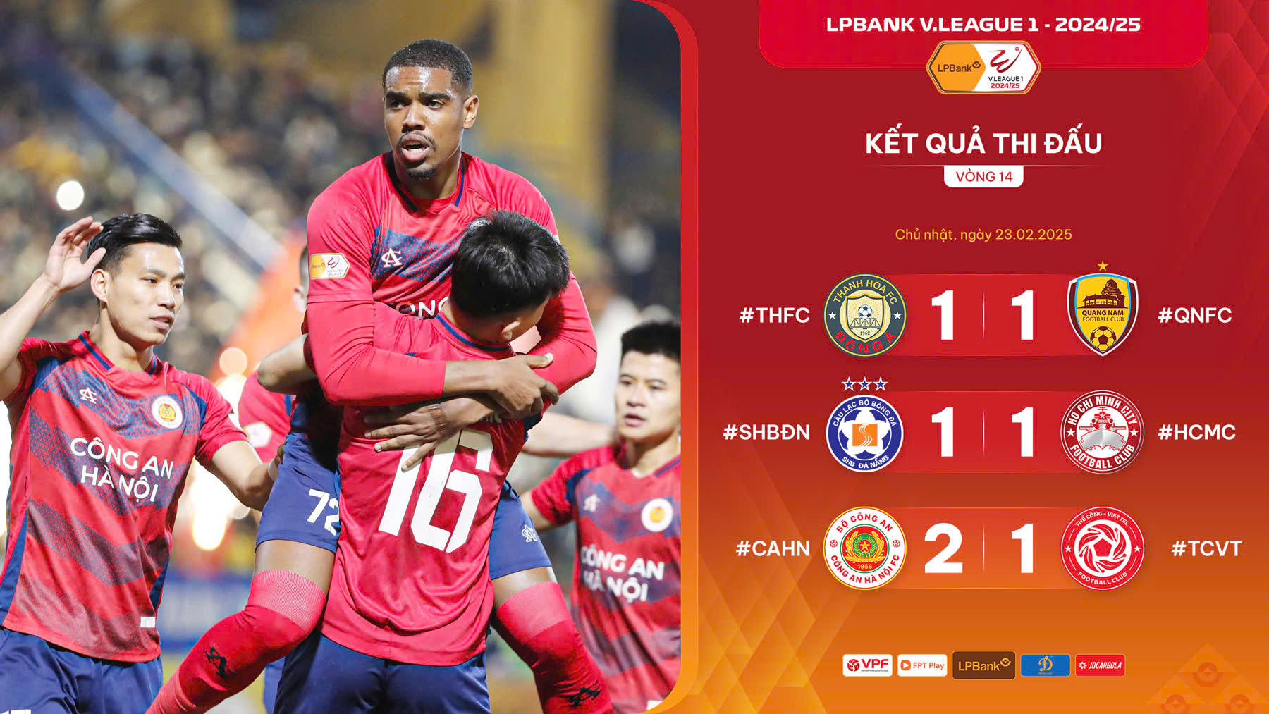 CLB Công an Hà Nội rất muốn “đòi nợ” CLB Thể Công Viettel, đồng thời muốn trở lại đường đua vô địch. Thầy trò HLV Polking đã thực hiện thành công theo một cách cực kỳ nghẹt thở, tạo cảm xúc bùng nổ cho những ai theo dõi trận cầu hấp dẫn này. Đội chủ nhà sớm có bàn thắng vượt lên ở phút 13 do công của Alan. Họ duy trì được lợi thế dẫn bàn tới tận những phút bù giờ hiệp 2. Và kịch tính được đẩy lên cao độ từ phút 90+5.