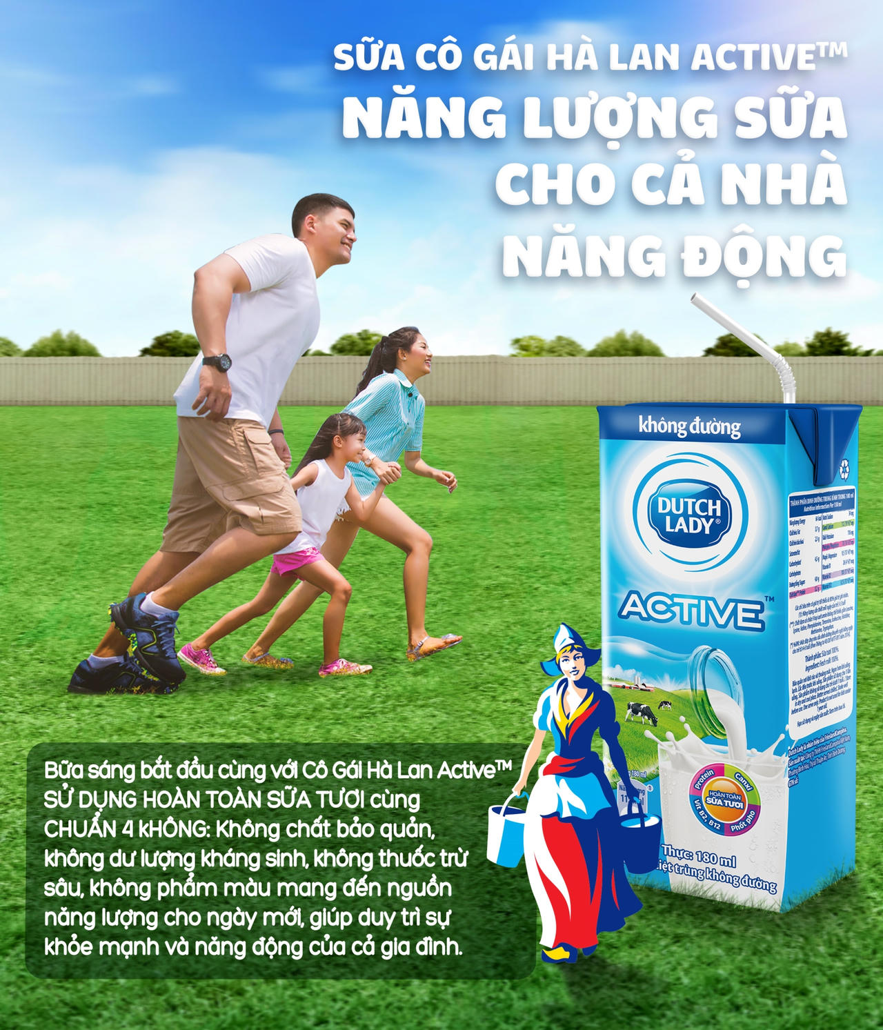 Nhờ công nghệ hiện đại từ châu u, quy trình khép kín “từ đồng cỏ đến ly sữa”, sữa tươi Cô gái Hà Lan Active tự tin cam kết tiêu chuẩn 4 KHÔNG quan trọng: Không chất bảo quản, không dư lượng kháng sinh, không thuốc trừ sâu, không phẩm màu. Nhờ thực hiện thu mua trực tiếp với khoảng 3.000 hộ chăn nuôi bò sữa đạt chuẩn trên toàn quốc, Cô gái Hà Lan đã có được nguồn nguyên liệu dồi dào, đảm bảo sử dụng hoàn toàn sữa tươi. Không chỉ thế, từ nhiều năm nay chất lượng nguồn cung cấp sữa tươi của Cô gái Hà Lan đã vươn lên chuẩn hàng đầu trong khu vực Đông Nam Á.