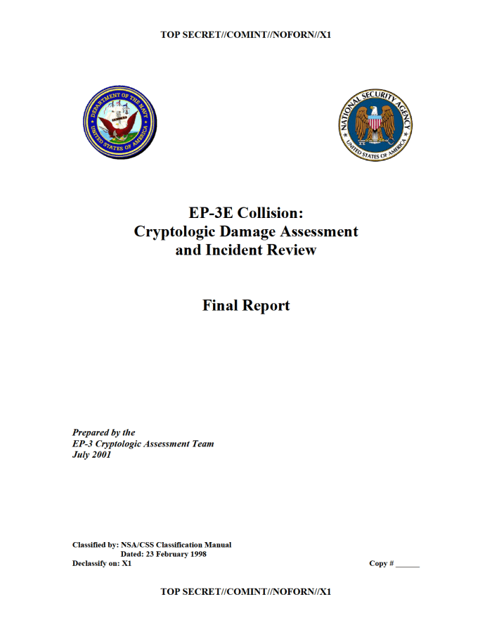 | Bản Báo cáo của Hải quân Mỹ và Cơ quan An ninh Quốc gia Mỹ (NSA) về vụ va chạm trên không nghiêm trọng giữa máy bay Mỹ và Trung Quốc năm 2001. |