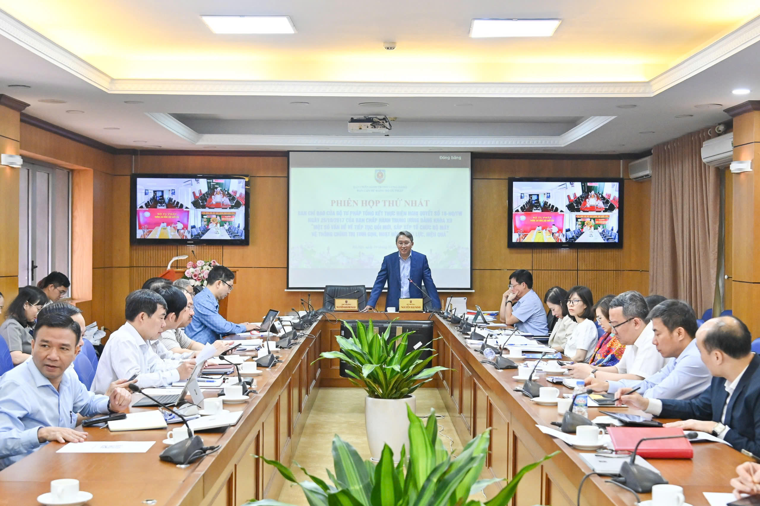 Bộ trưởng Nguyễn Hải Ninh, Trưởng Ban chỉ đạo của Bộ Tư pháp về tổng kết thực hiện Nghị quyết số 18-NQ/TW ngày 25/10/2017 của Ban Chấp hành Trung ương khóa XII chủ trì Phiên họp thứ nhất. |