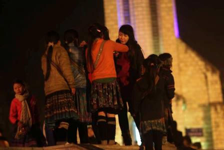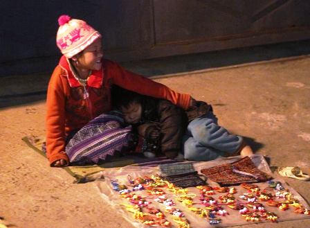 Gần như ở mọi nơi trong thị trấn Sapa, từ vệ đường, góc chợ…, những đứa trẻ dân tộc H’Mông trong những bộ cánh mỏng, co quắp trong buốt giá vẫn cố gắng thều thào những câu bằng tiếng Kinh lõm bõm: “Mua cho cháu đi cô ơi”; “Mua cho cháu đi chú ơi”. Những lúc vãn khách, những đứa trẻ ngồi bệt trên nền đường trải 1 tấm nilon mỏng, đứa lớn ôm đứa nhỏ, cắn chặt môi trong buốt giá.
