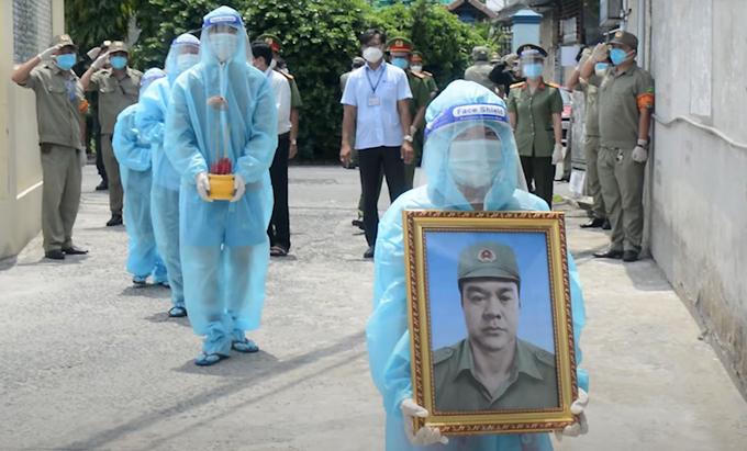 Đan Thanh ôm di ảnh ba và Nhật Hào ôm bát hương ngày 16/8, ba ngày sau khi ba qua đời. Đám tang được chính quyền tổ chức trọng thể. Ảnh: Gia đình cung cấp.