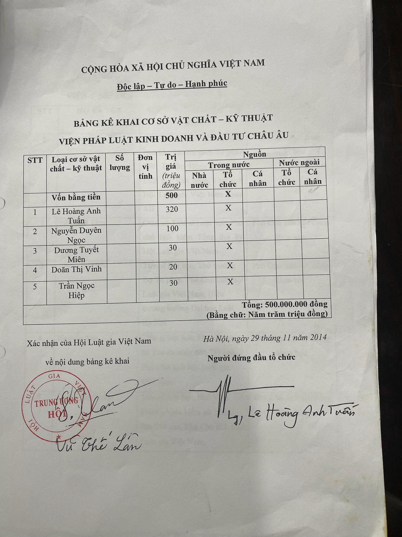 Dựa trên Điều lệ, bản xác nhận tài sản của IEBLI, thành viên sáng lập của Viện bao gồm (1) Lê Hoàng Anh Tuấn với vốn góp 340 triệu; (2) Nguyễn Duyên Ngọc 100 triệu; (3) Dương Tuyết Miên 30 triệu; (4) Doãn Thị Vinh 20 triệu; (5) Trần Ngọc Hiệp 30 triệu.