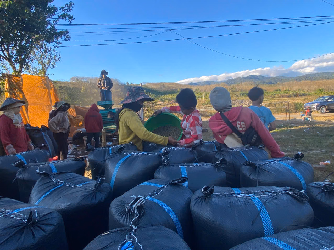 Khi chúng tôi đến nhà anh A Chả, sân trước rộn ràng tiếng máy xát vỏ cà phê. Vào mùa thu hoạch, các hộ trong thôn thường giúp nhau theo cách “đổi công”, không phải thuê nhân công. Hôm nay sang rẫy nhà này, ngày mai lại sang rẫy nhà khác