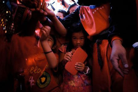 Một bé gái Trung Quốc mắc kẹt trong đám đông đang ùa tới giành kẹo và quà được ném xuống bởi một đoàn múa sư tử tại đền Tien Hou, Kuala Lumpur, Malaysia nhân dịp năm mới.