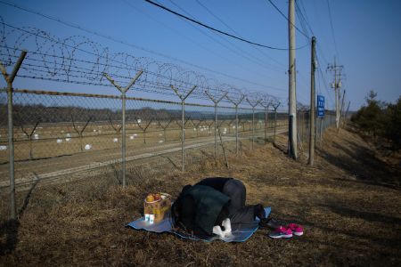 Cụ Kang Myeong-wook (phải) một người sinh ra tại Triều Tiên đang cùng cháu gái quỳ tại hàng rào khu phi quân sự ở Imjingak, Paju, Hàn Quốc, hướng về quê nhà cầu khấn sáng mùng 1 Tết.