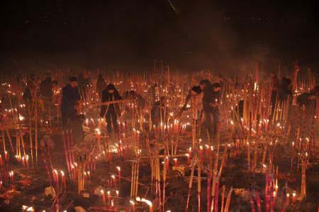 “Cánh đồng nhang” nghi ngút khói tại một ngôi đền ở Trùng Khánh, Trung Quốc, nơi rất nhiều người đến cầu phúc đêm giao thừa.