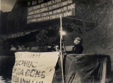 Đồng chí Võ Nguyên Giáp trong Lễ tổ chức thành lập ĐộiViệt Nam Tuyên truyền giải phóng quânở khu rừng Trần Hưng Đạo (Cao Bằng), ngày 22/12/1944. Nguồn Trung tâm Lưu trữ quốc gia III, PCB 01.2011 |