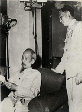 Chủ tịch Hồ Chí Minh, Đại tướng Võ Nguyên Giáp đang xem tập ảnh chiến thắng Biên giới,năm 1950. Nguồn Trung tâm Lưu trữ quốc gia III, tài liệu ảnh LIII, SLT 394 - BH21. |