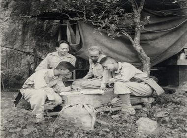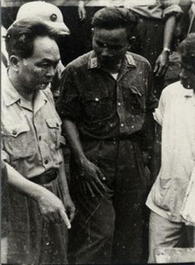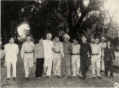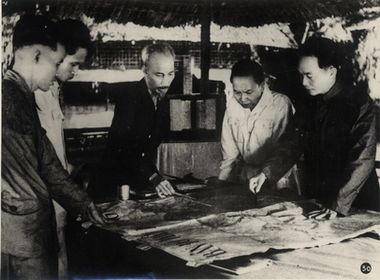 Chủ tịch Hồ Chí Minh cùng các đồng chí Trường Chinh, Phạm Văn Đồng, Võ Nguyên Giáp quyết định mở chiến dịch Điện Biên Phủ, năm 1954. Nguồn Trung tâm Lưu trữ quốc gia III, tài liệu ảnh LIII, SLT 412. |