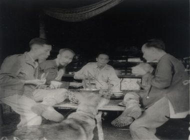 Bữa cơm thân mật của Chủ tịchHồ Chí Minh với các đồng chí Trường Chinh, Võ Nguyên Giáp,Lê Đức Thọ tại Việt Bắc, năm 1947. Nguồn Trung tâm Lưu trữ quốc gia III, tài liệu ảnh LIII, SLT 386 - BH8. |